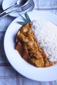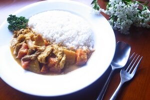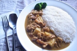 雞腿肉、胡蘿蔔、馬鈴薯、香辣咖哩醬、椰漿、樹薯粉